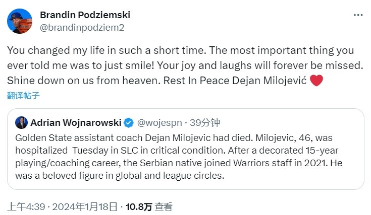 勇士球员波杰姆斯基更推悼念:“你在如此短的时间内改变了我的生活,你告诉过我的最重要的事就是微笑!我将永远怀念你的欢乐和笑声。从天堂照耀我们吧,安息吧米洛耶维奇❤️。”