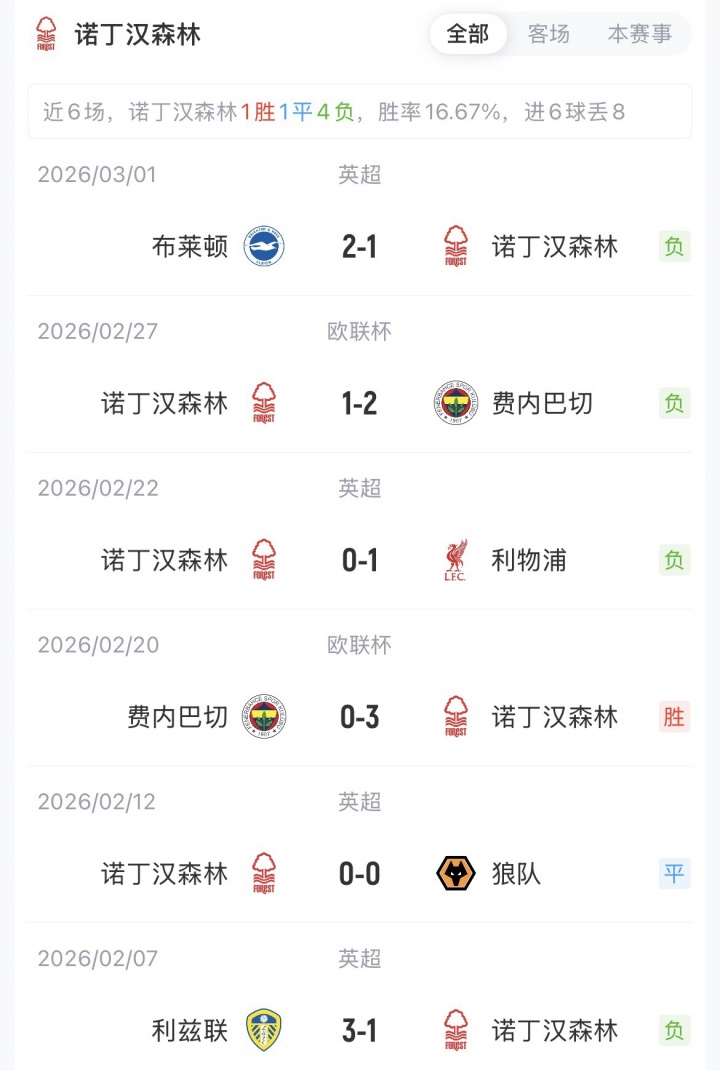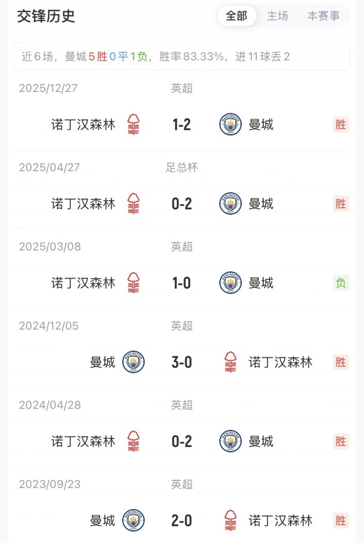 曼城暂以59分排名第二,少赛一场落后榜首5分。森林27分暂排第17名,只领先降级区2分。