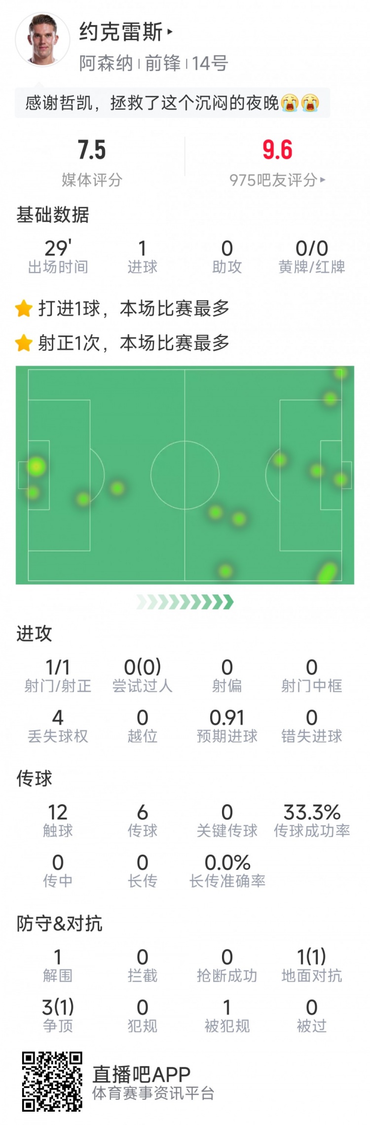 - 约克雷斯本场数据:替补打进关键球,1次射门,1解围,评分7.5分