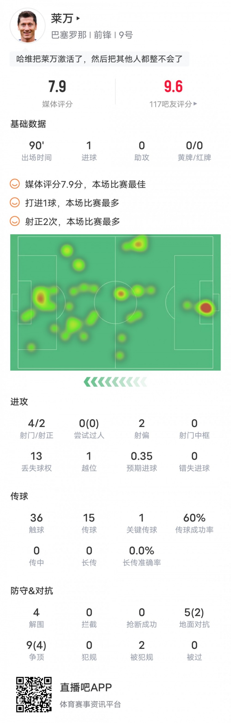 莱万本场比赛数据:1进球1关键传球4解围,评分7.9全场最高