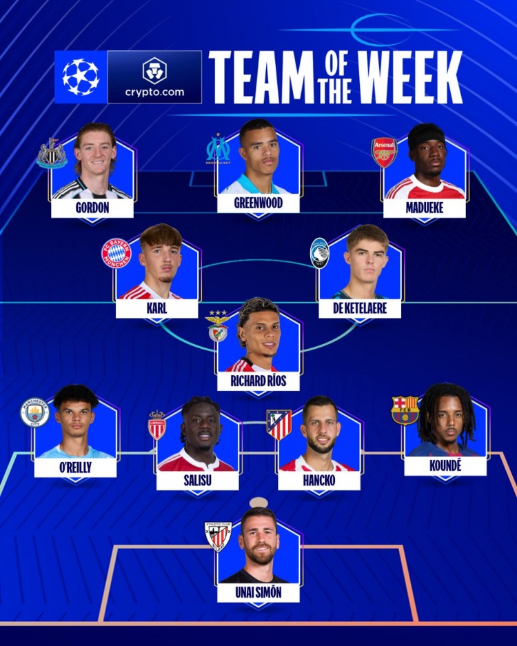 - 欧冠本轮最佳阵:马杜埃凯、格林伍德、奥赖利、孔德、卡尔入选