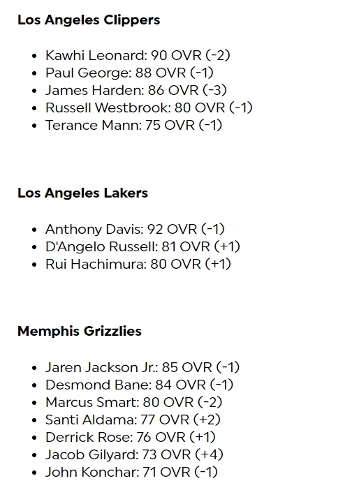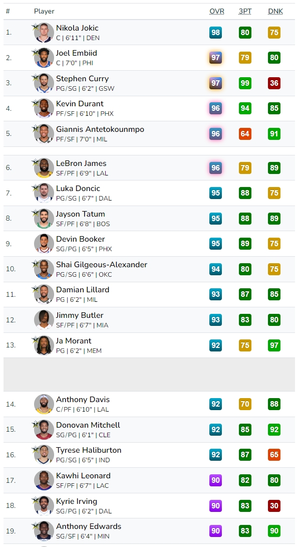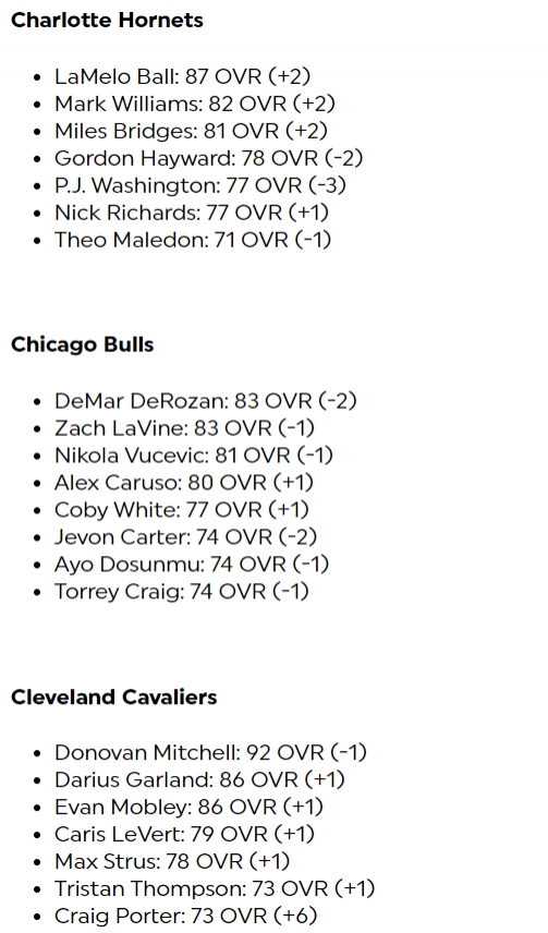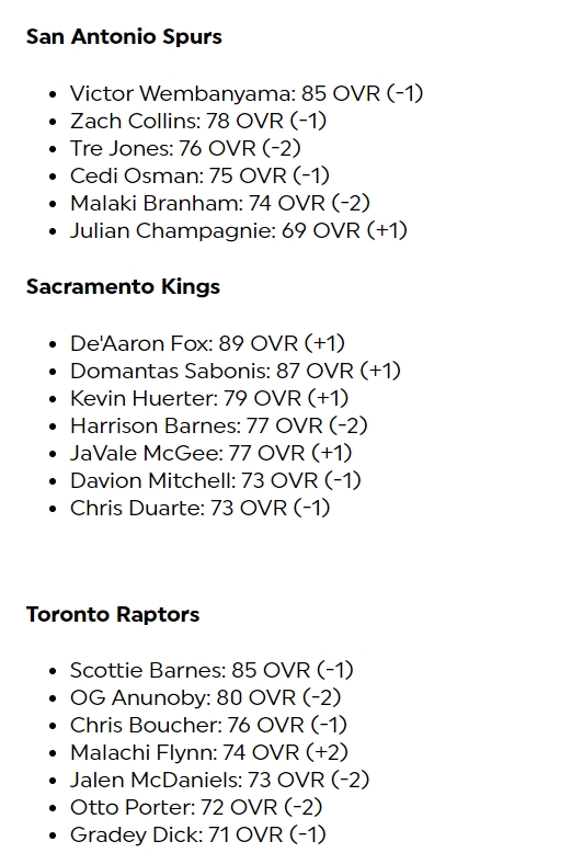 其中库里-1来到96,布克+1来到95,东契奇-1来到95,亚历山大+1来到94,哈利伯顿+2来到92,欧文+1来到90,文班亚马-1来到85、霍姆格伦+2来到85,莱昂纳德-2来到90,哈登-3来到86。