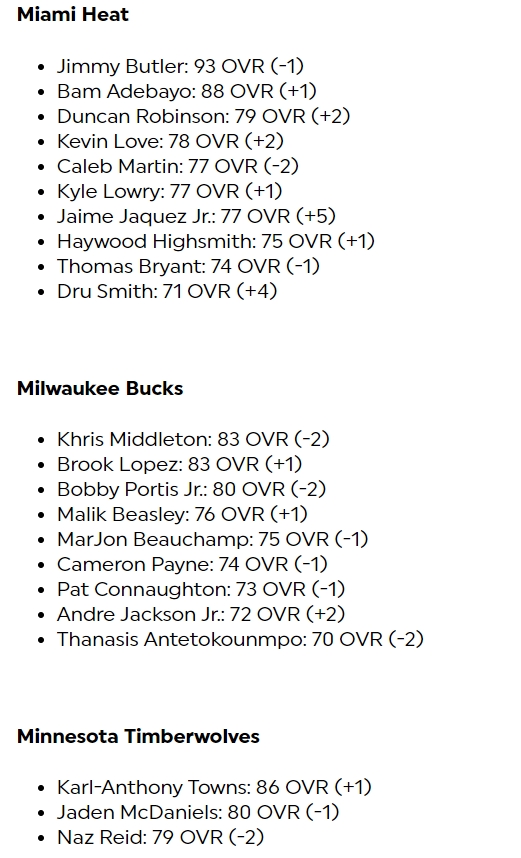 其他一些值得关注的球员能力值变化——巴特勒93(-1)、浓眉92(-1)、米切尔92(-1),福克斯89(+1)、锡安88(-1)、杰伦-布朗88(-1)、乔治88(-1)、拉梅洛-鲍尔87(+2)、申京85(+1)、克莱82(-1)、威少80(-1)普尔79(-2)、维金斯76(-3)、哈克斯77(+5)、小乔丹75(+3)。