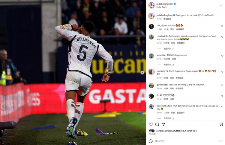 11月27日讯 西甲联赛第14轮,皇马3-0战胜加的斯,本场比赛贝林厄姆伤愈复出,并在比赛中打入一球。赛后贝林厄姆更新社媒:回来的感觉真好