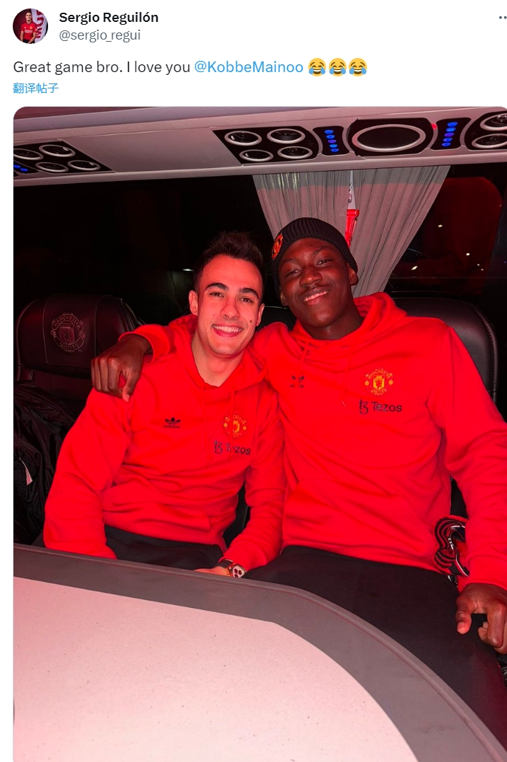 11月27日讯 在本轮英超,曼联客场3-0击败埃弗顿。本场比赛,18岁小将科比-梅努迎来个人首次英超首发,发挥十分出色。赛后,雷吉隆也在社交媒体上晒出了自己和梅努