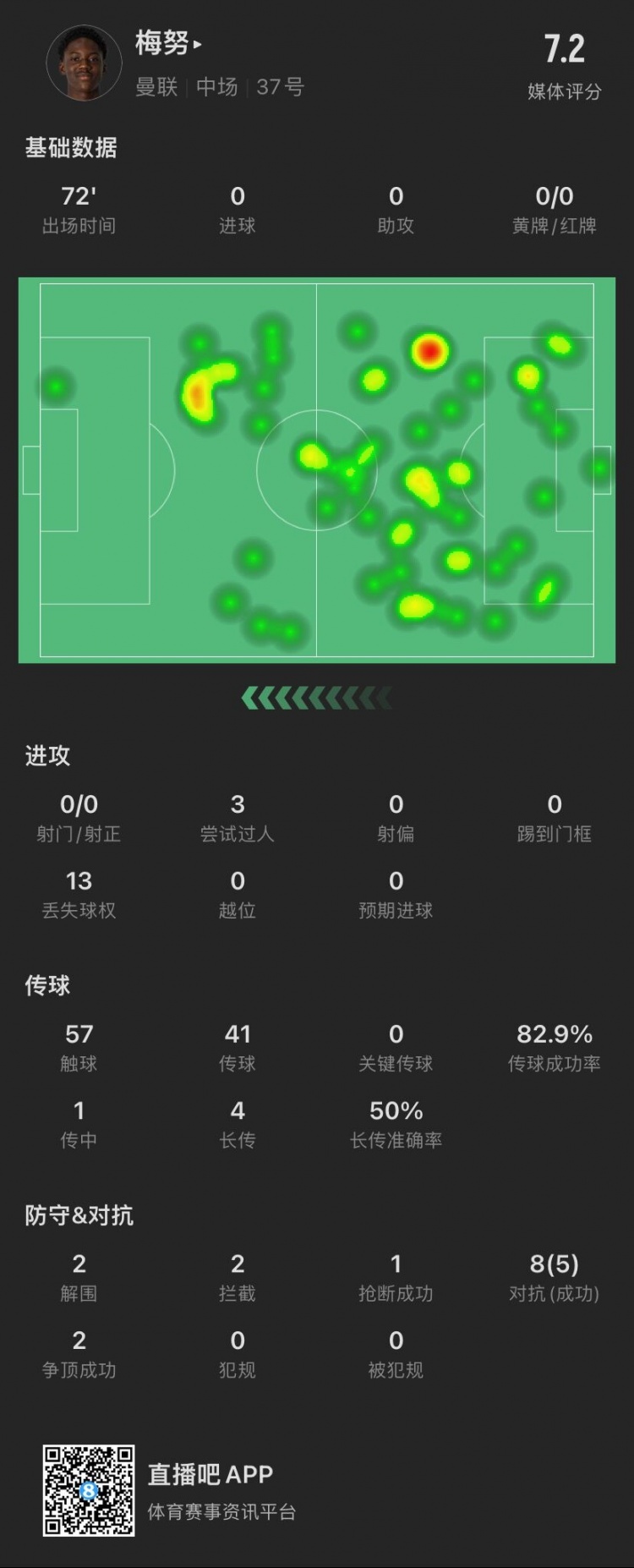 11月27日讯 英超第13轮,曼联客战埃弗顿的比赛正在进行。本场比赛,18岁的梅努迎来个人首次英超首发,发挥惊艳,并在第72分钟被换下场。梅努本场数据↓出场时间:71