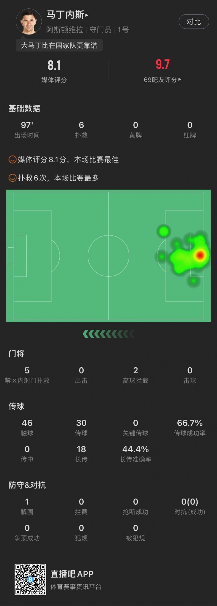 马丁内斯本场数据:被射正8脚贡献6次扑救,评分8.1并列全场最高