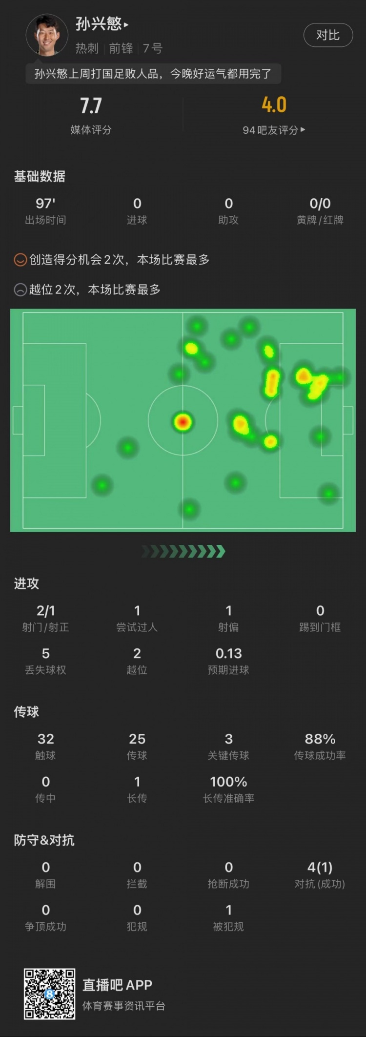 11月27日讯 英超第13轮,热刺主场1-2不敌维拉。孙兴慜全场数据: