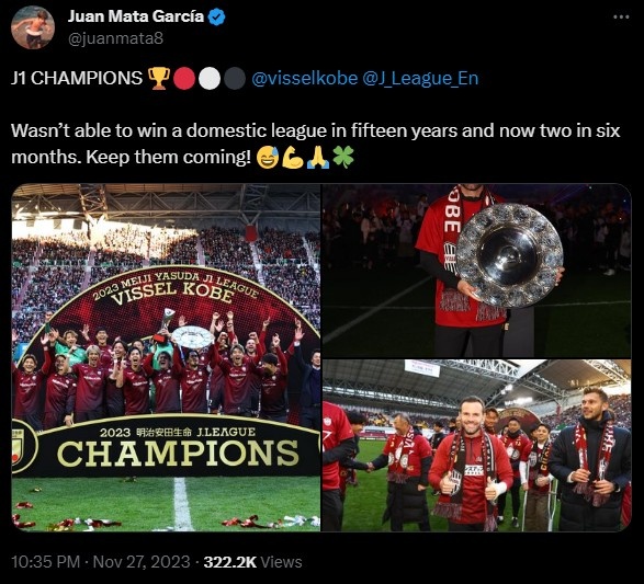 11月28日讯 今天,西班牙老将马塔在推特发文,庆祝与神户胜利船一起赢得J联赛冠军。