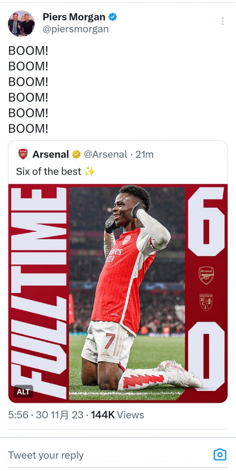 赛后,英国著名主持人、枪手球迷皮尔斯-摩根在社交媒体上连发了六个“BOOM!”,庆祝这场大胜。