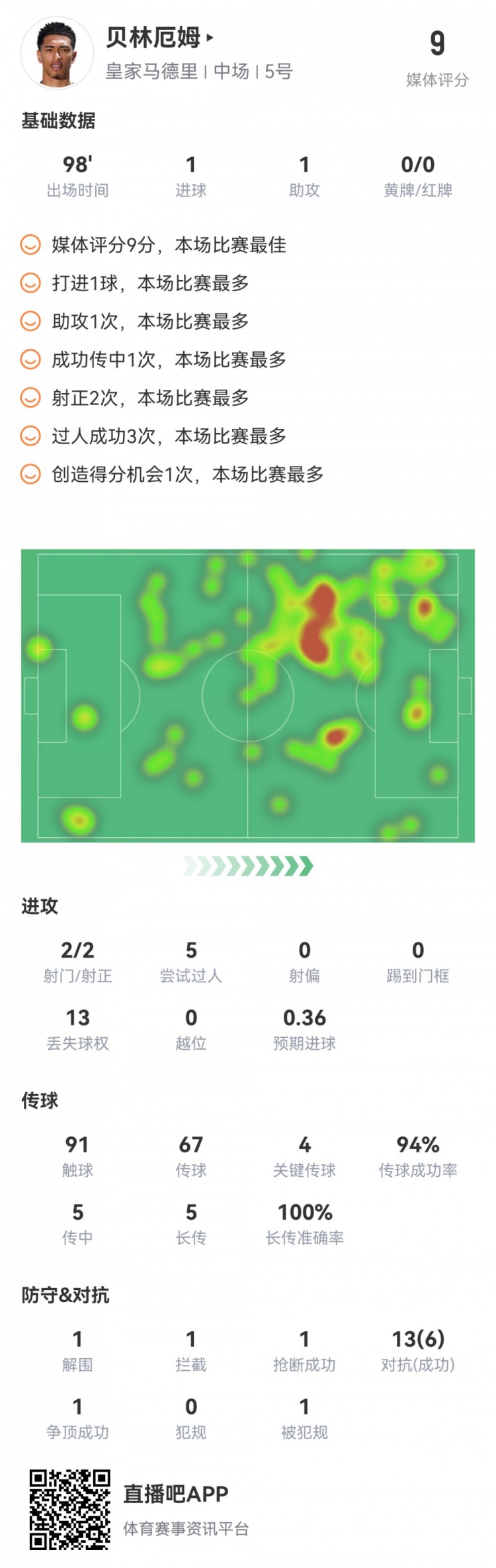 贝林厄姆数据:传射建功,4次关键传球,获评全场最高9分