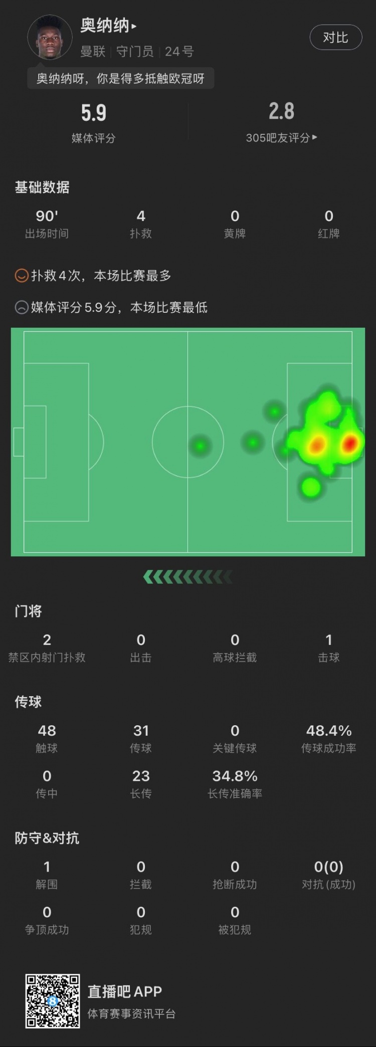 奥纳纳全场数据:4次扑救丢掉3球,1次解围,评分5.9全场最低