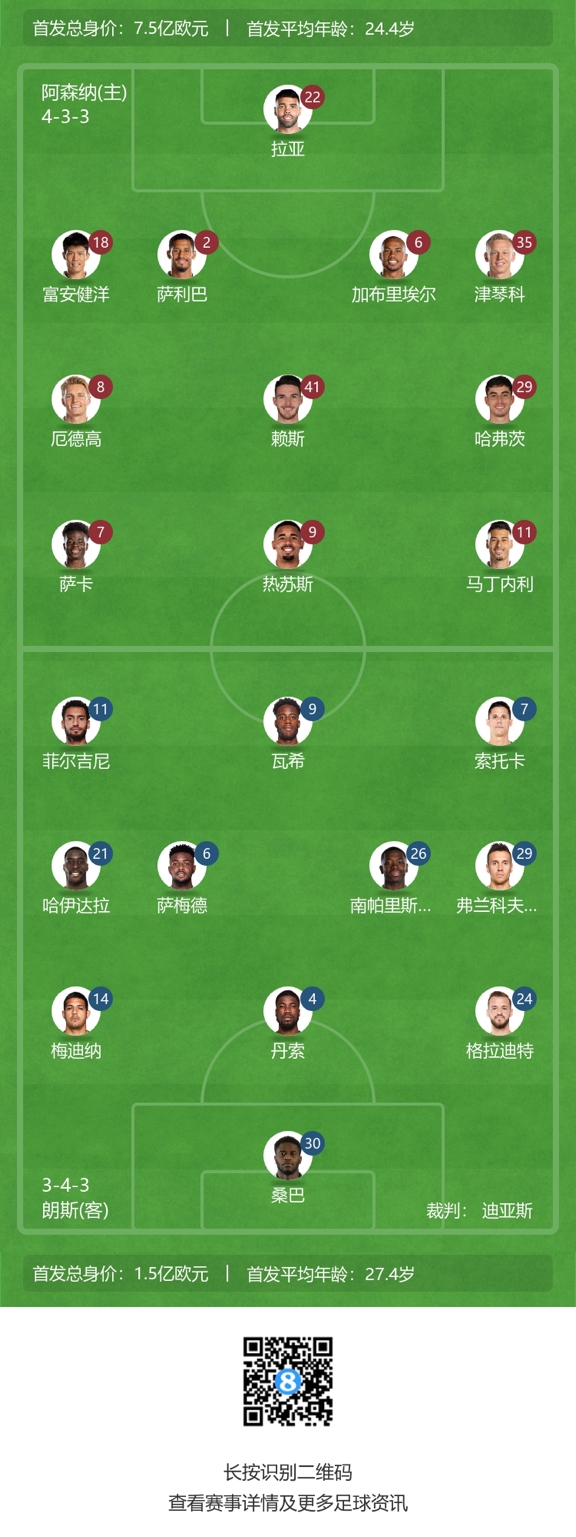 朗斯首发:30-桑巴、4-丹索、14-梅迪纳、21-马萨迪奥-海达拉、24-格雷迪特、6-萨迈德、26-南帕利斯-门迪、11-菲尔吉尼、29-弗兰科夫斯基、7-索托卡、9-瓦希
