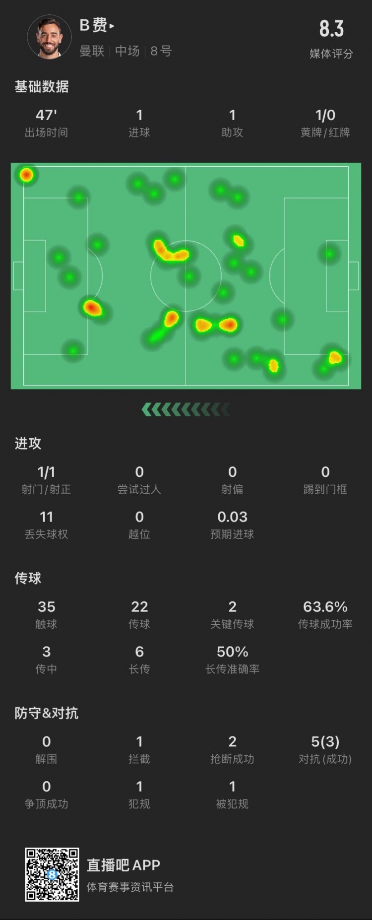 B费数据:半场1传1射,传球成功率仅63.6%,评分8.3半场最高