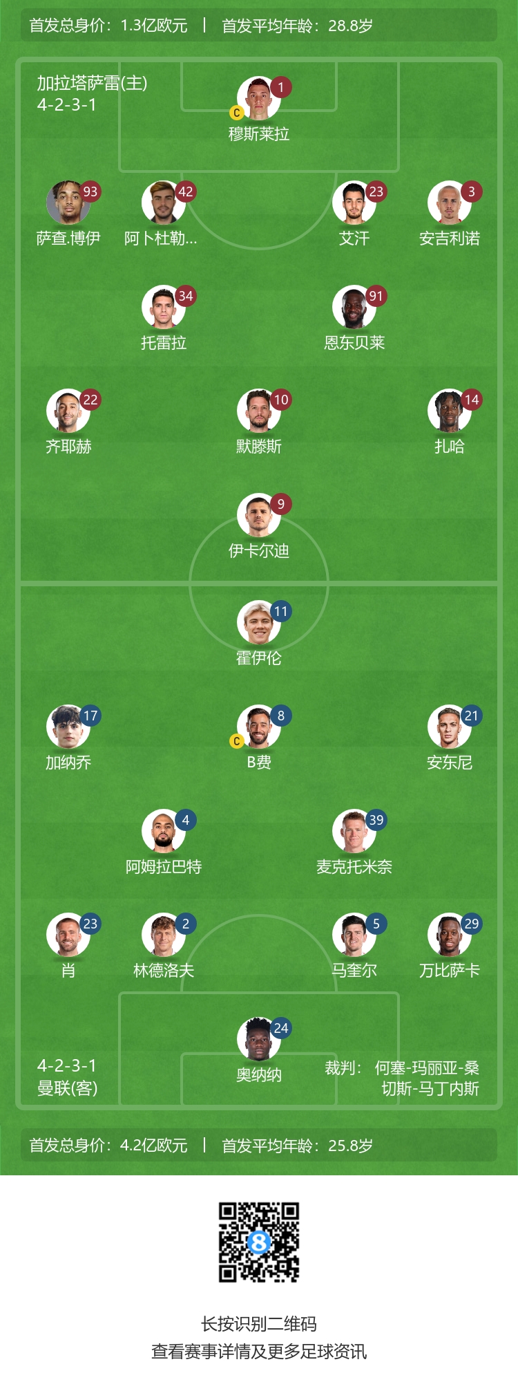 加拉塔萨雷首发:1-穆斯莱拉、93-博伊、42-阿卜杜克里姆、23-艾汗、3-安吉利诺、91-恩东贝莱、34-托雷拉、22-齐耶赫、10-默滕斯、14-扎哈、9-伊卡尔迪