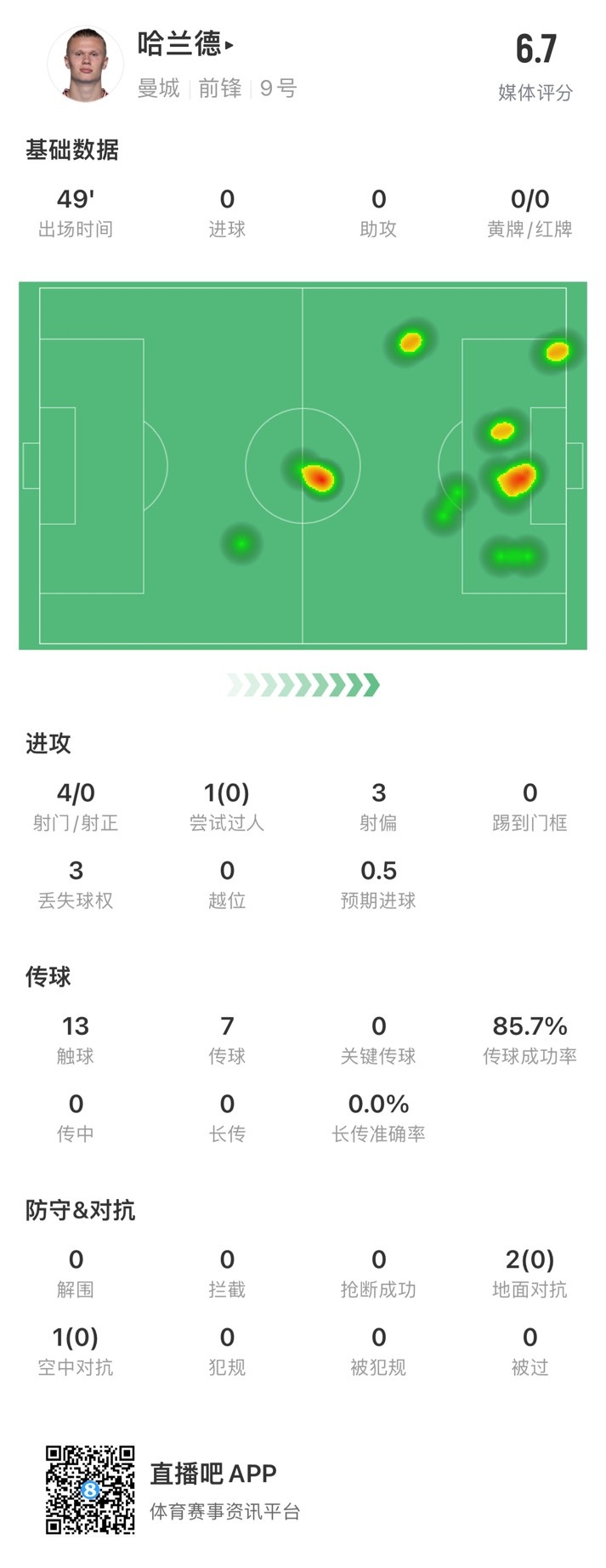 哈兰德半场数据:4次射门0次射正,失空门失良机,获评6.7分