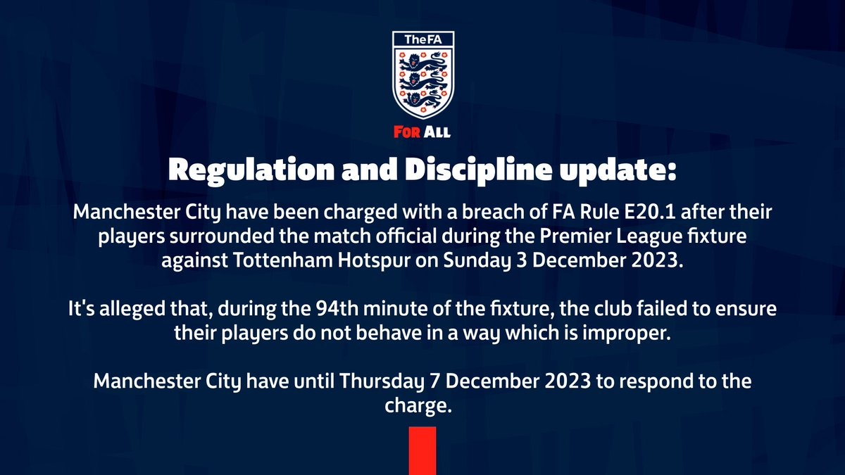曼城因违反英足总规则E20.1而受到指控,在2023年12月3日对阵热刺的英超比赛中,曼城球员围攻了裁判。