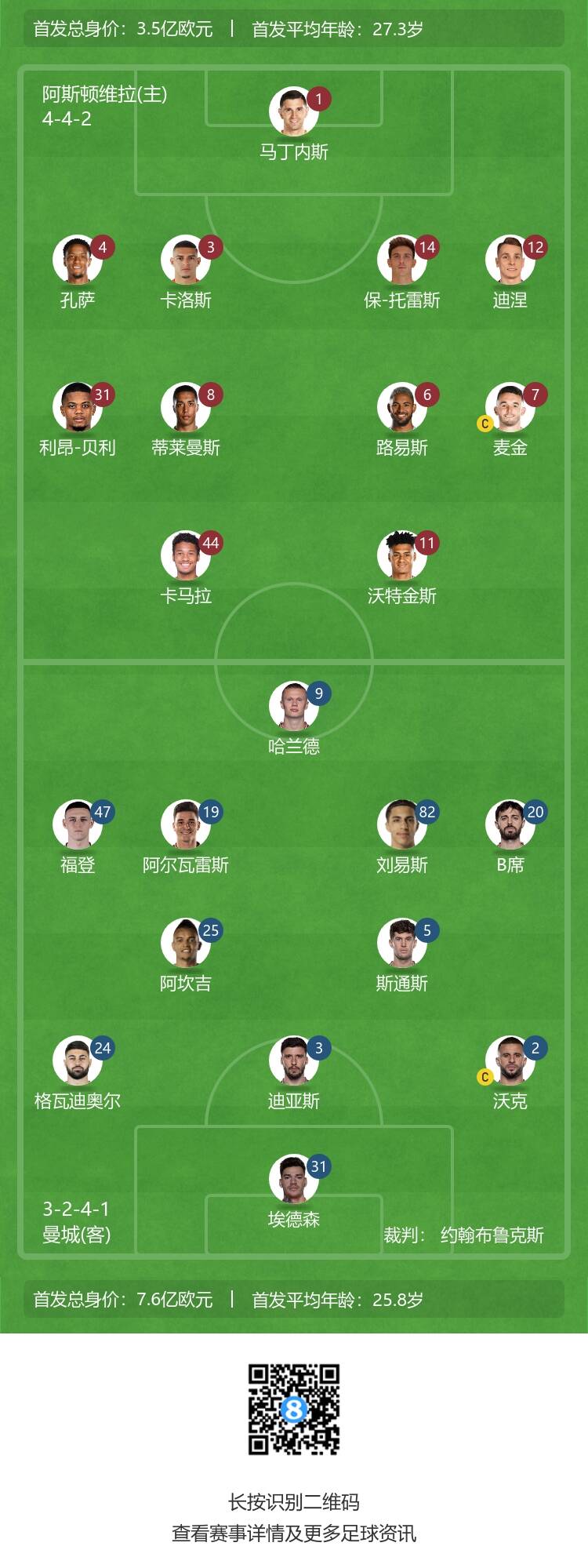 曼城vs维拉首发:哈兰德领衔 小蜘蛛、B席、福登出战