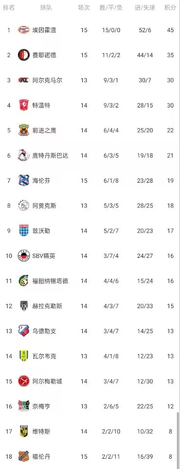 12月8日讯 在本轮荷甲联赛中,埃因霍温2-0击败海伦芬。本场过后埃因霍温已经在本赛季保持15场荷甲全胜战绩,打进52球,仅失6球,净胜球高达46球,已领先次席的费耶