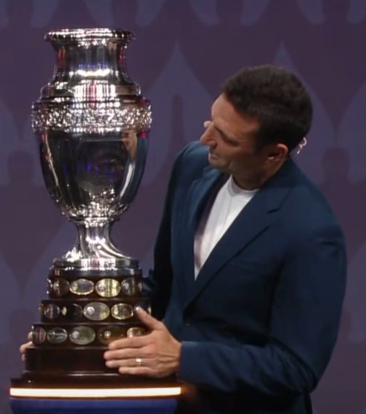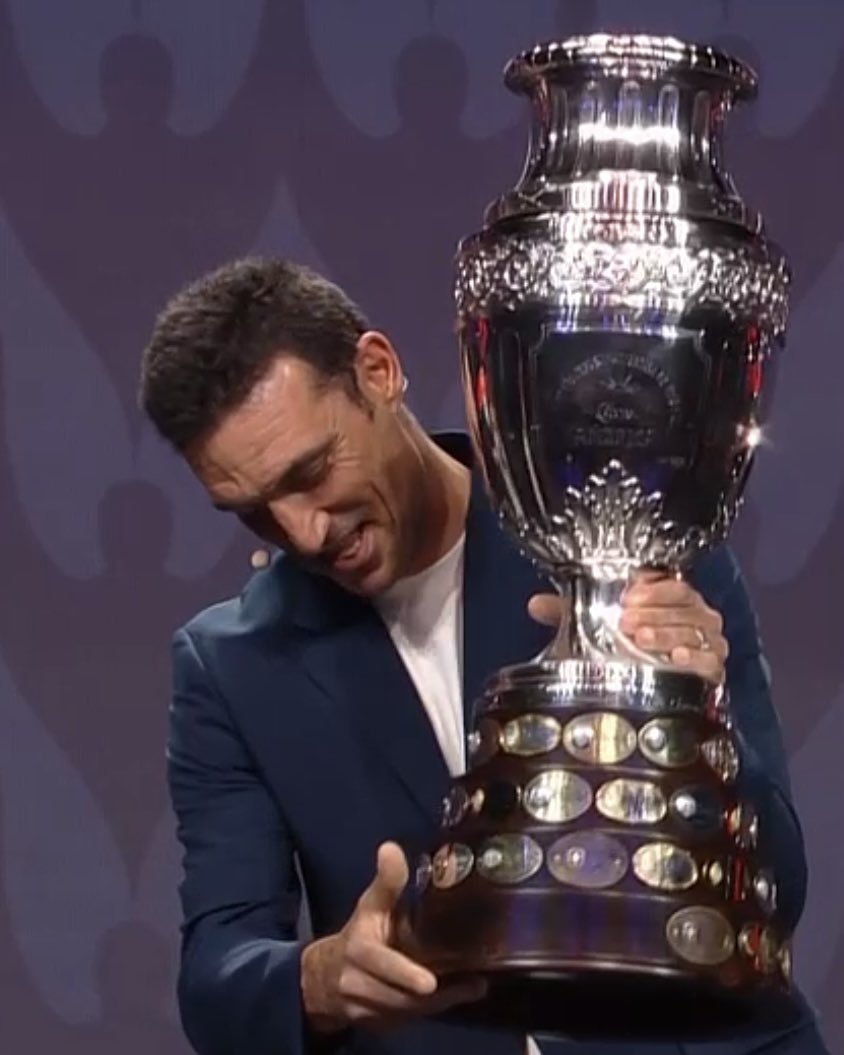 眼里全是爱!美洲杯抽签开始前,斯卡洛尼捧着新美洲杯奖杯出场