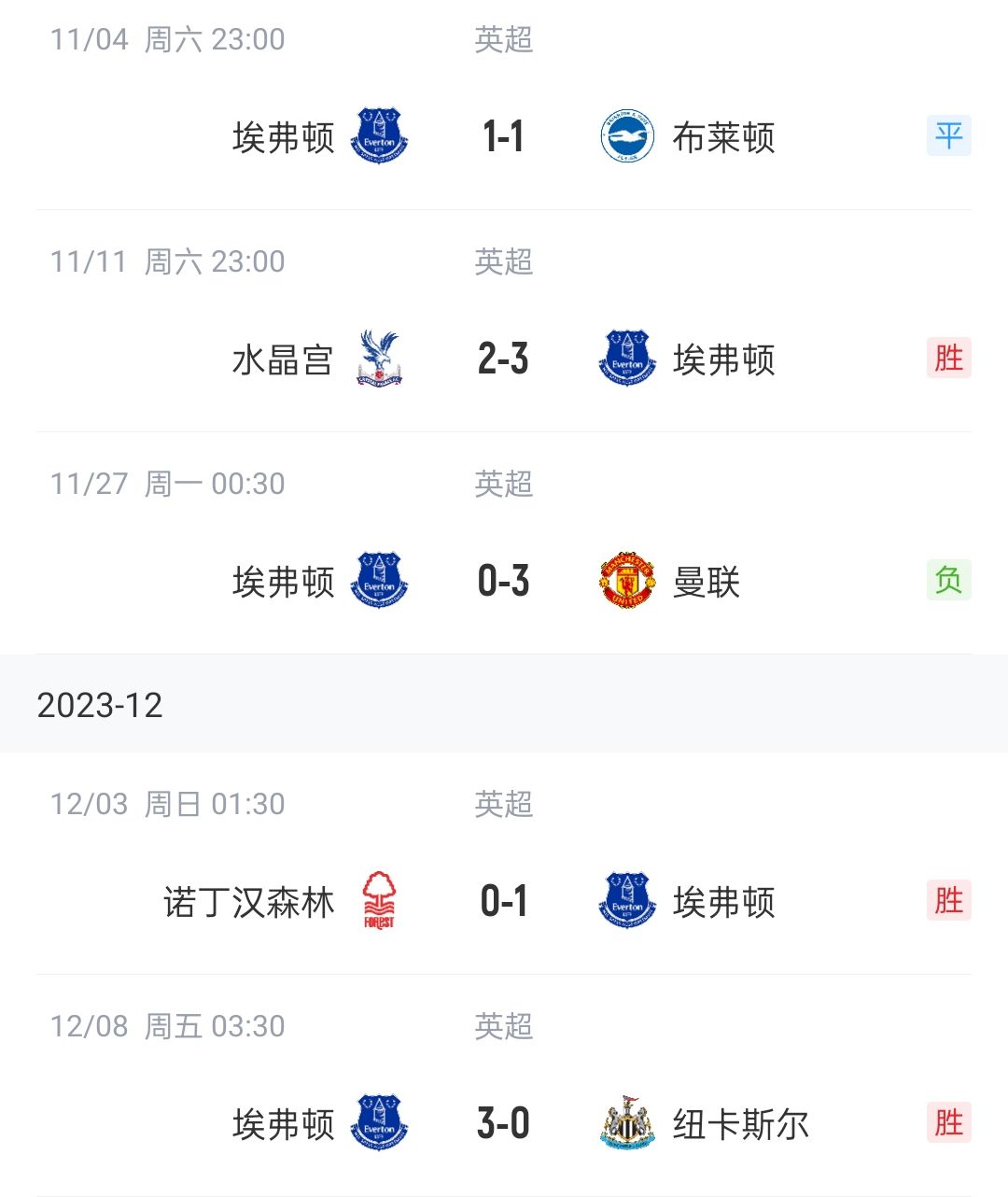 12月8日讯 英超第15轮,埃弗顿主场3-0击败纽卡,太妃糖近5轮拿到10分。