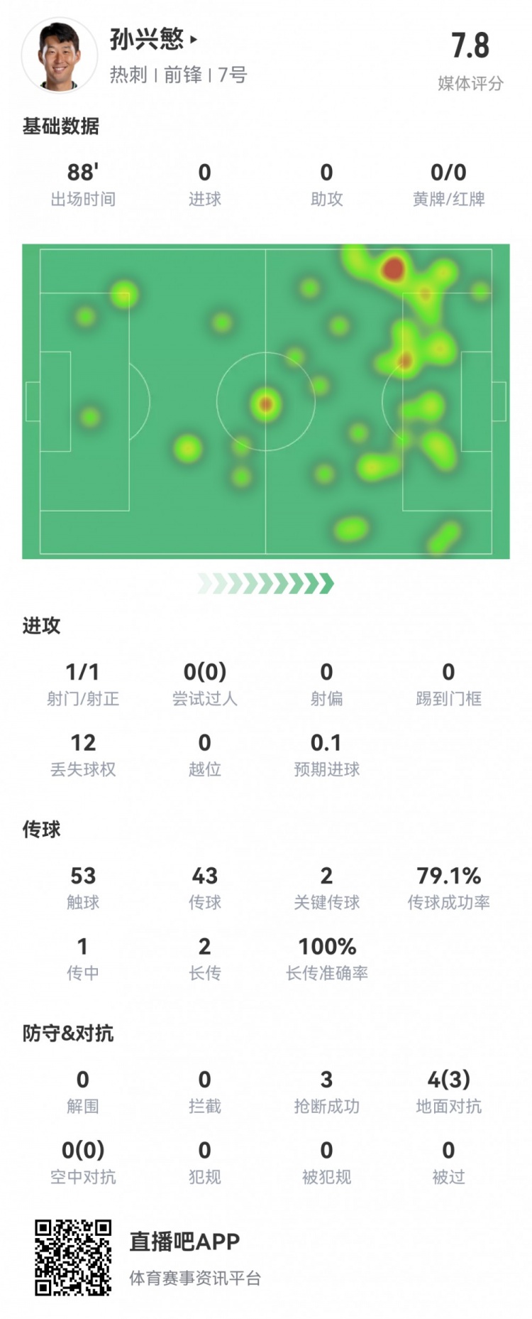 孙兴慜数据:88分钟伤退全场仅1射门 0过人3抢断 评分7.8