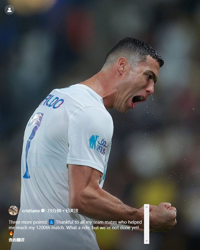 赛后C罗更新社媒:三分入账!感谢所有帮我达成1200场比赛的队友们,这是一段不平凡的旅程,但我们还没有结束!