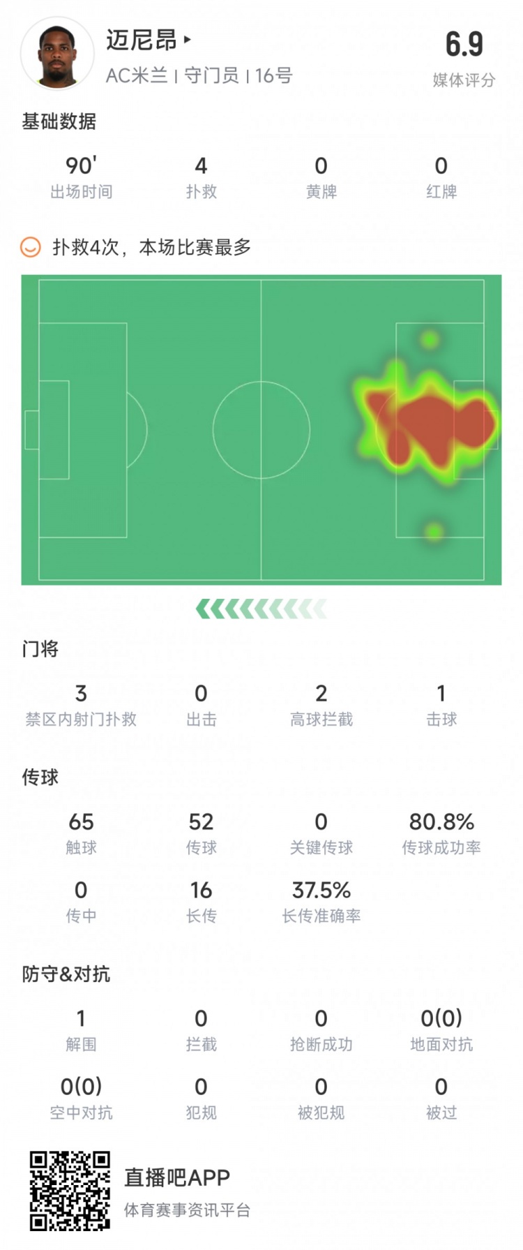 迈尼昂本场数据:4次成功扑救,3次禁区内扑救,传球成功率80.8%
