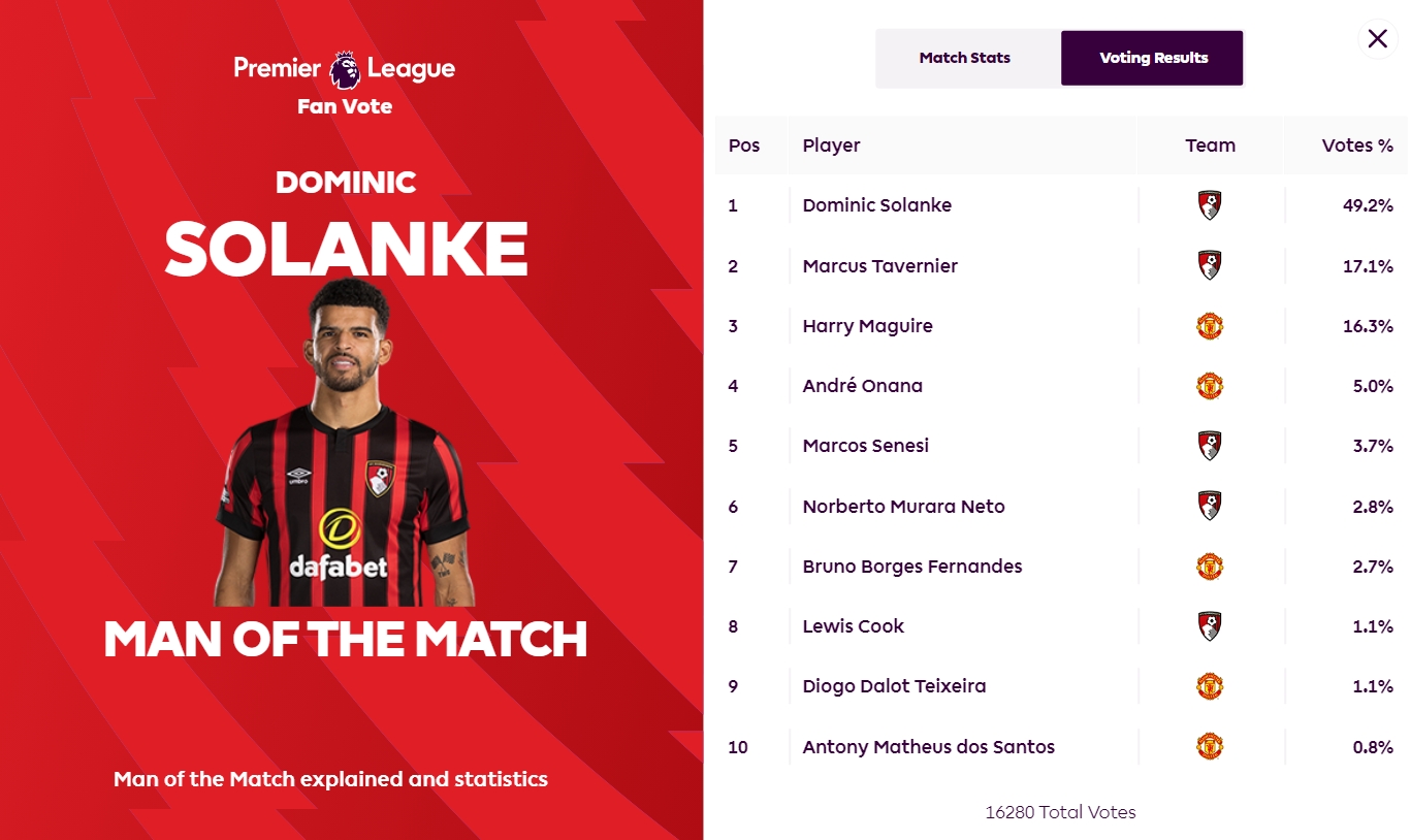 赛后,英超官方宣布,伯恩茅斯前锋索兰克当选本场比赛全场最佳球员。