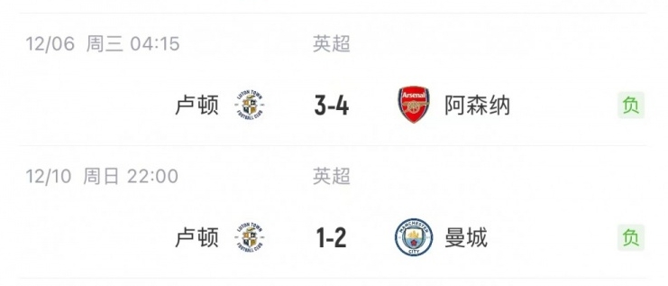 反向维拉?卢顿最近2轮英超连续遭到阿森纳、曼城的逆转