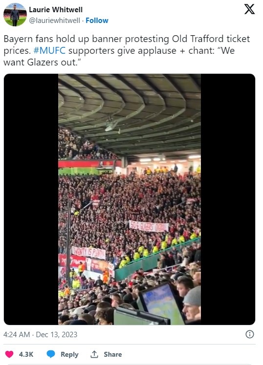 据悉,拜仁球迷经常会在欧冠客场抗议票价太高,而曼联球迷对格雷泽家族积怨已久,在这个问题上,双方达成了一致,看到拜仁球迷的横幅后,曼联球迷朝对方鼓掌并唱道:“我们要格雷泽家族滚蛋。”