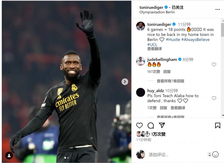 赛后吕迪格在社交媒体上晒出自己庆祝的照片,并写道:“6场比赛=18分。很高兴回到我的家乡柏林。”