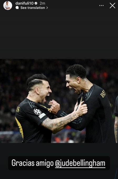 12月13日讯 今天凌晨,皇马在欧冠中3-2击败柏林联合,赛后塞巴略斯在Instagram晒出自己与贝林厄姆的合照,感谢他的助攻。