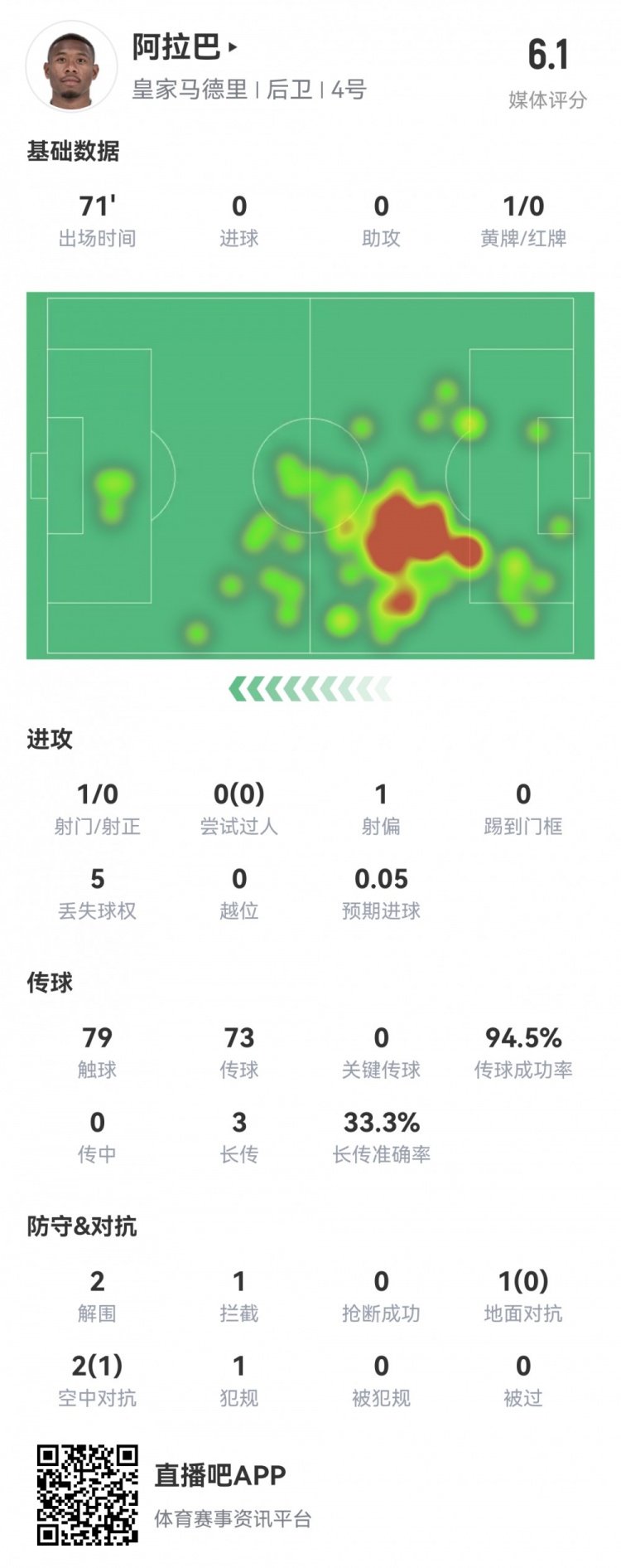 12月13日讯 本轮欧冠皇马暂2-1领先柏林联,此役阿拉巴状态不佳,一次致命失误导致球队丢球,他也在第71分钟被换下,球员全场数据如下↓出场71分钟79次触球传球成