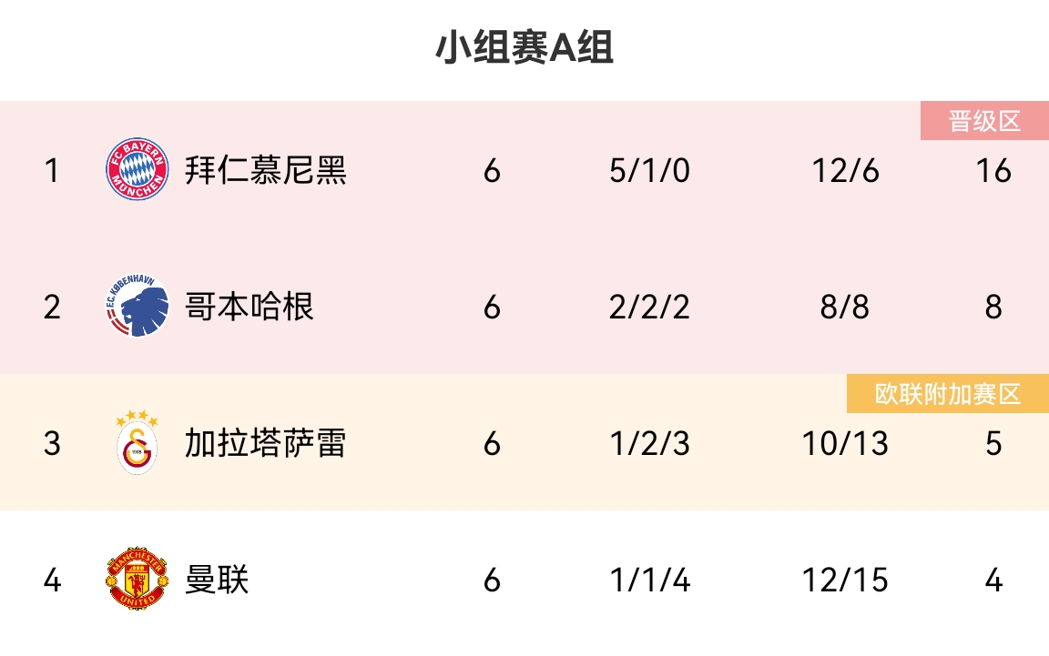 曼联主场0-1不敌拜仁,哥本哈根1-0加拉塔萨雷。积分榜上,曼联4分垫底出局,拜仁5胜1平第一出线!哥本哈根8分第二晋级,加拉塔萨雷5分第三。