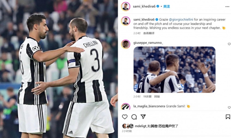 12月13日讯 现年39岁的基耶利尼宣布退役,结束23年球员生涯。前尤文中场赫迪拉更新社媒,祝福了老队友。