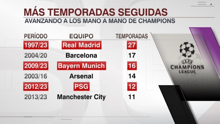 欧冠历史连续小组出线榜:皇马27年居首,巴萨、拜仁二三位