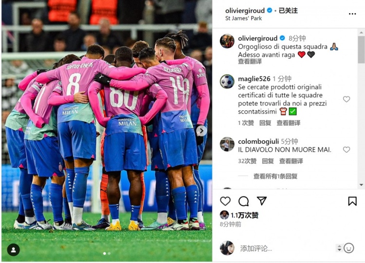 12月14日讯 在欧冠小组赛最后一轮比赛中,吉鲁助攻普利西奇破门,帮助米兰客场2比1击败纽卡,以小组第三身份进入欧联杯。赛后吉鲁在社交媒体上晒出米兰球员们的