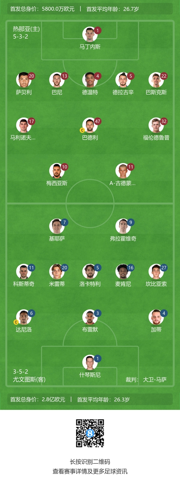 热那亚首发:1-J-马丁内斯、4-德温特、5-德拉古辛、13-巴尼、20-萨贝利、22-J-巴斯克斯、17-马利诺夫斯基、32-弗伦德卢普、47-巴代利、11-古德蒙德森、10-梅西亚斯
