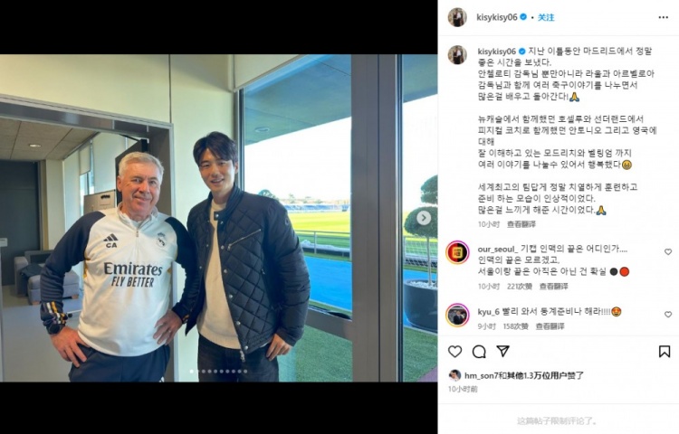 12月17日讯 近日,韩国足球名宿寄诚庸造访了皇家马德里俱乐部,他也与主教练安切洛蒂及众多皇马球星合影。寄诚庸在社媒晒照表示,过去两天他在皇马度过了一段美