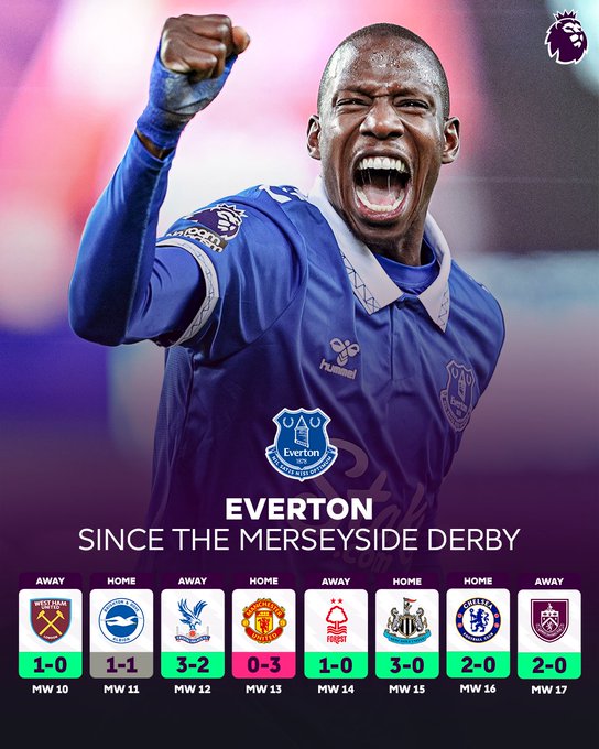 埃弗顿近8场英超豪取6胜:3-0纽卡、2-0切尔西,仅0-3输曼联