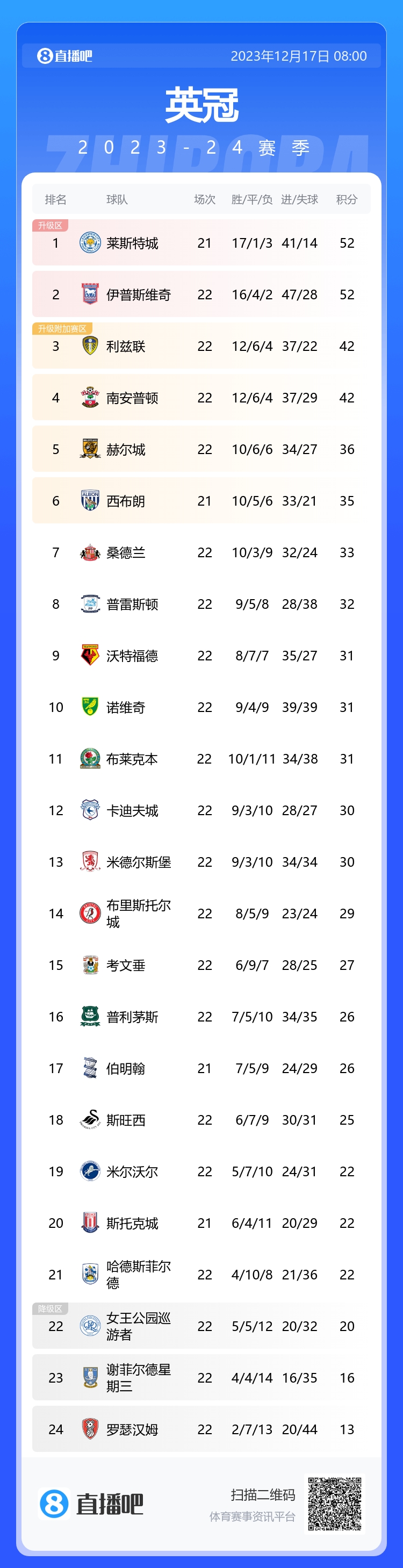 本赛季英超升班马卢顿、伯恩利、谢菲联在英超积分榜上排倒数上赛季英超降级队莱斯特城、利兹联、南安普顿在英冠积分榜上排前列