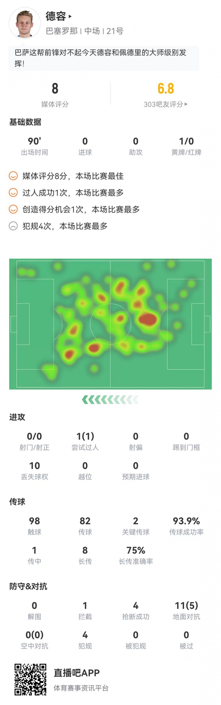 全场最佳!德容数据:82传球93.3%成功率 2次关键传球 1拦截4抢断