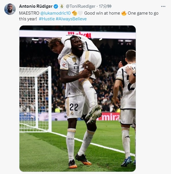 赛后吕迪格晒出了他肩扛莫德里奇的赛场照,并且写道:“大师@莫德里奇