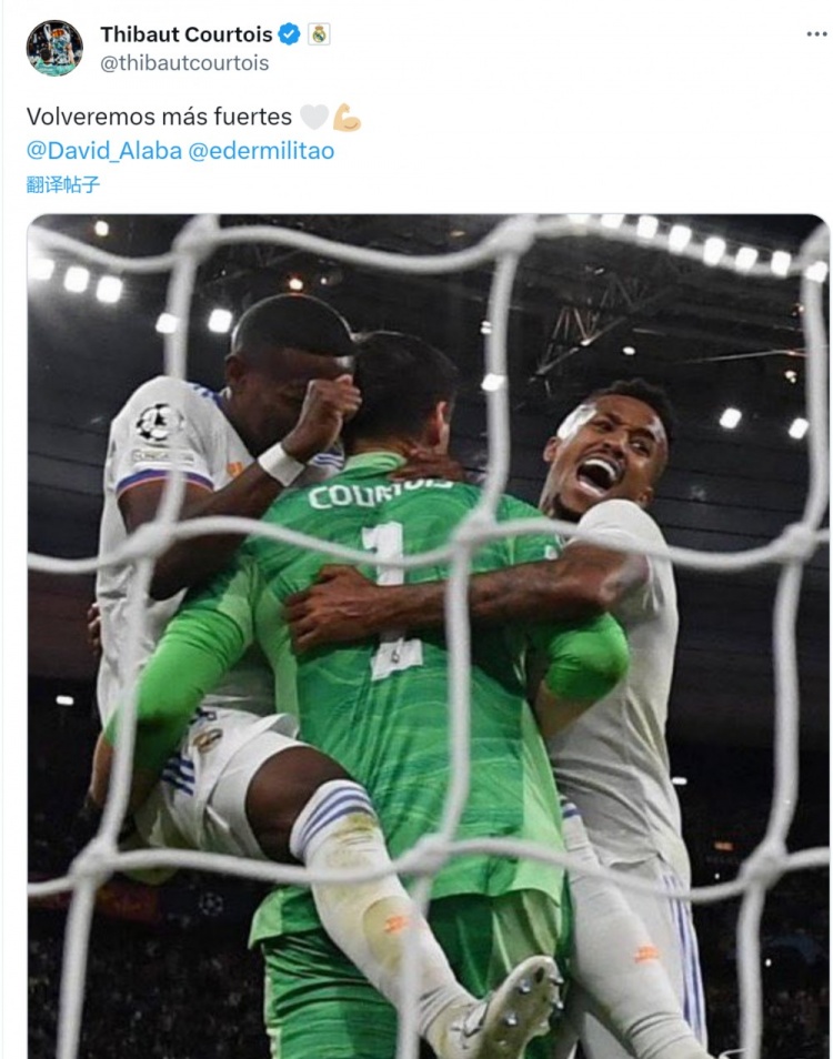 库尔图瓦、米利唐、阿拉巴三名皇马球员皆遭遇十字韧带伤势,库尔图瓦在社交媒体上晒出自己与米利唐、阿拉巴拥抱的照片,并写道:“我们将以更强大的姿态回归