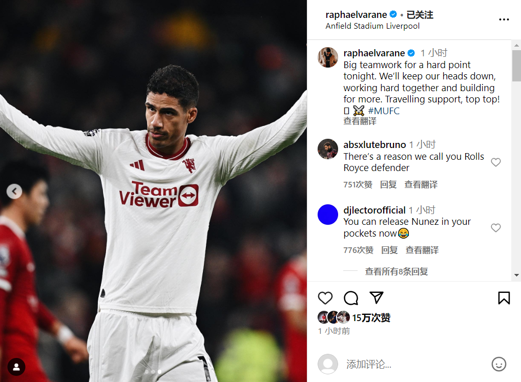 12月18日讯 本轮英超焦点战,曼联三军用命战平利物浦。赛后瓦拉内发文鼓励球队。瓦拉内:出色的团队表现拿到了艰难的一分,我们要继续保持低调埋头努力工作,为了