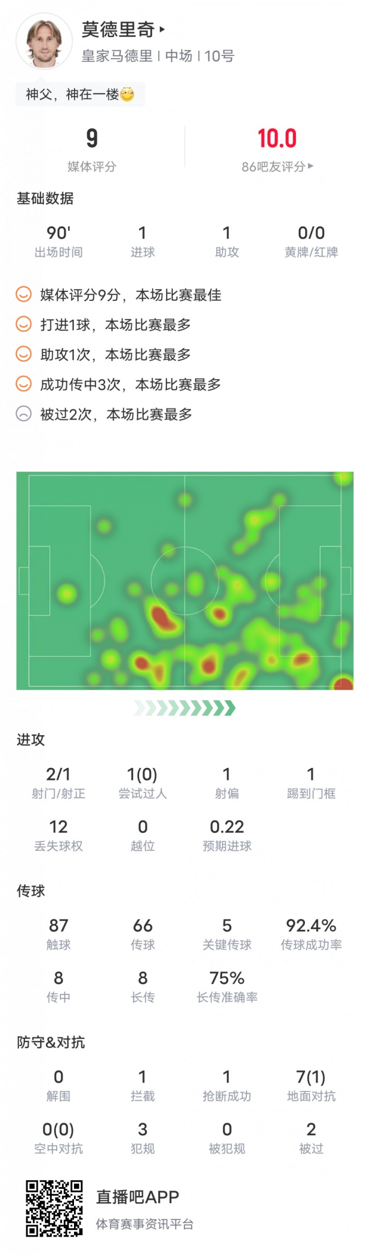 12月18日讯 在今日凌晨进行的一场西甲联赛中,皇马4-1击败比利亚雷亚尔。本场比赛,皇马中场莫德里奇首发出战发挥出色,传射建功,评分9.0全场最高。莫德里奇本场