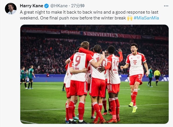 12月18日讯 本轮德甲,拜仁主场3-0战胜斯图加特,凯恩梅开二度。赛后凯恩发推庆祝:“这是一个很棒的夜晚,这使得我们能够收获连胜,并且能够对上周的表现做出一个