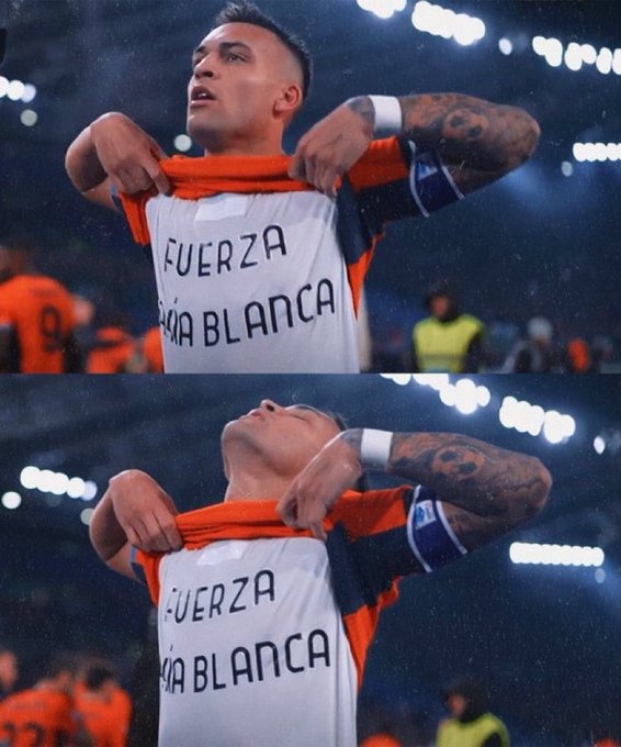 进球之后的劳塔罗掀开球衣露出里面的T恤,上面写着:“加油布兰卡港。”
