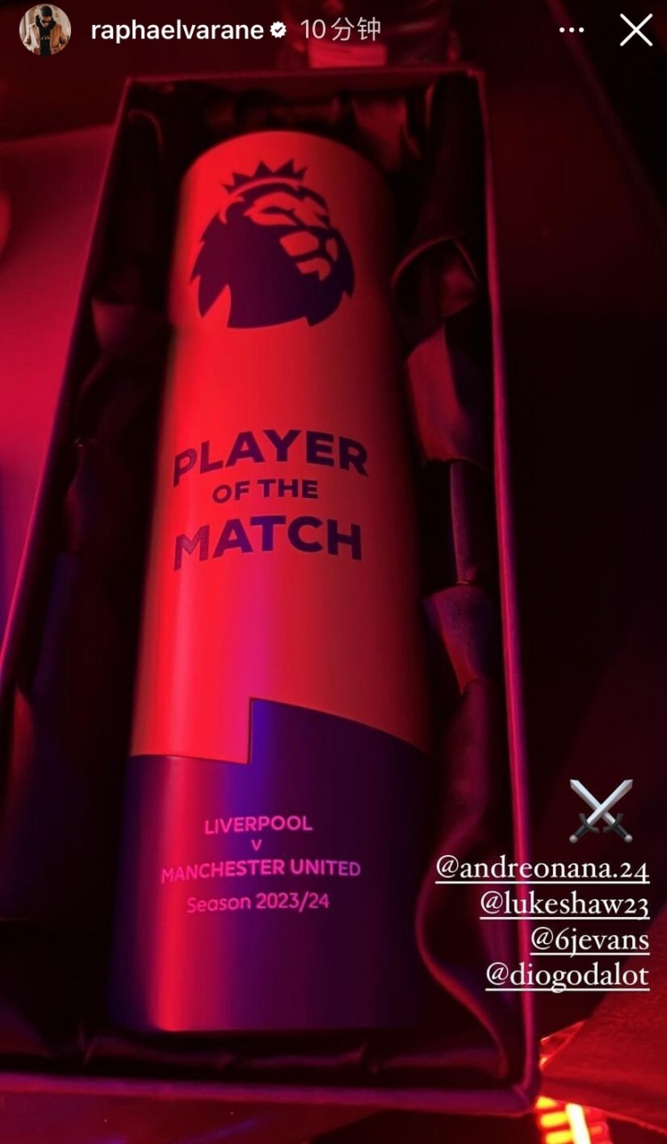 瓦拉内晒出这座全场最佳奖杯,并@了自己的后防搭档奥纳纳、卢克-肖、埃文斯以及达洛特。